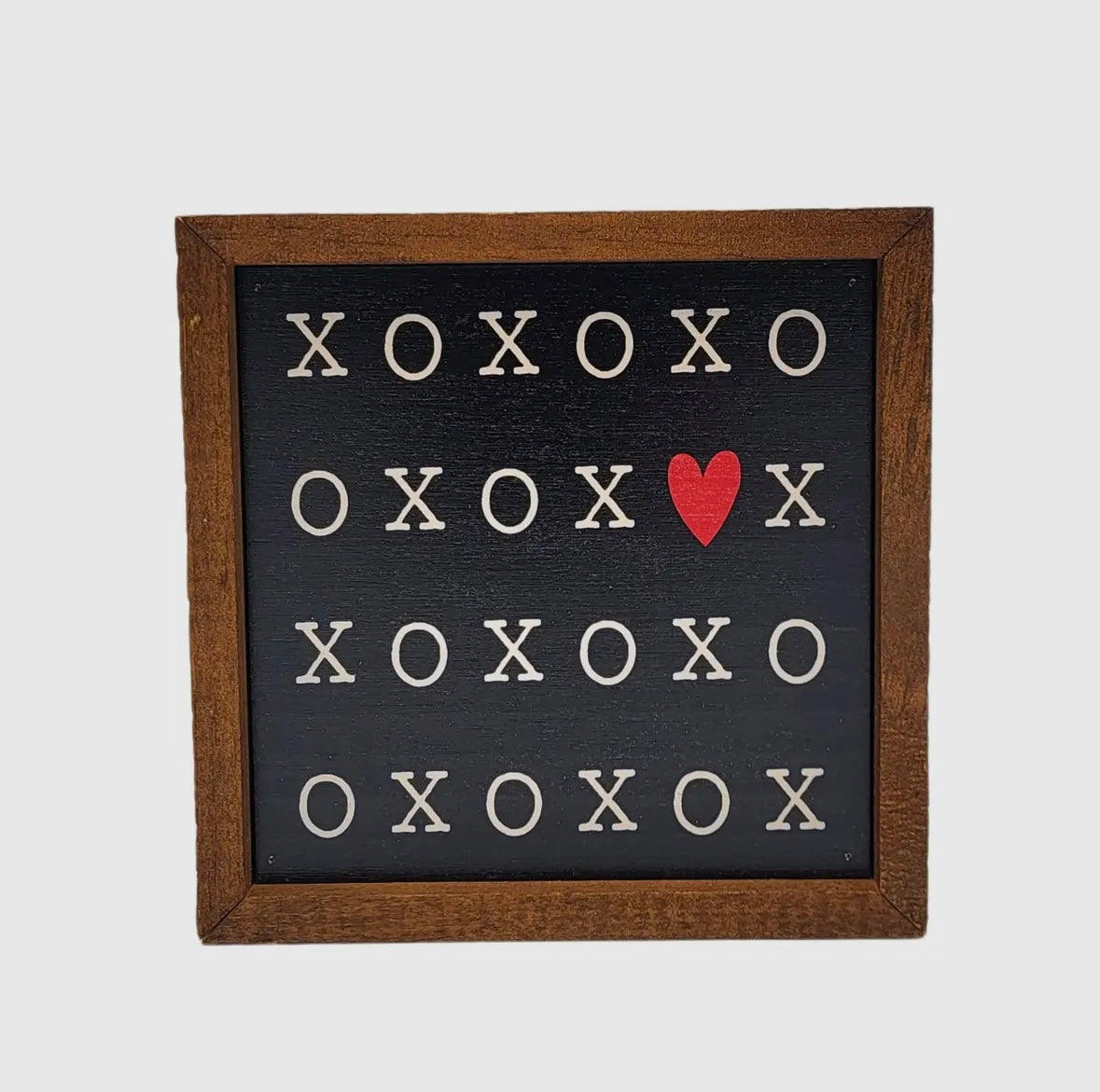 XOXO Heart Sign. This sign is built into a wooden box frame with a rustic touch. All of these signs can be easily hung directly off of the frame or will stand upright on shelves or desks.