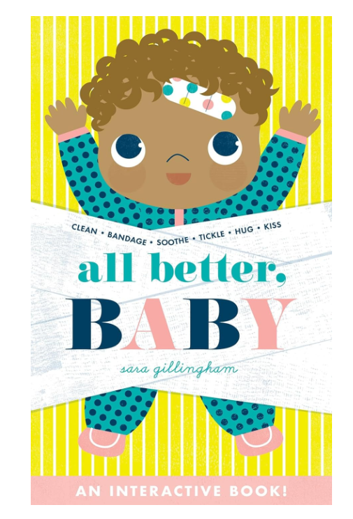 All Better, Baby! is an interactive novelty board book that plays like a doll and reads like a gentle manual about how to soothe a baby. Sara Gillingham has incorporated real tactics for newborn care, giving the text an authenticity and purpose. Interactivities include putting a bandage on a scraped knee, rubbing ointment on an itchy bug bite, and more, and all are accompanied by tender, instructive narration.Perfect for soon-to-be older siblings or doll-crazy toddlers, this book encourages children to read while they play and practice empathy and care.