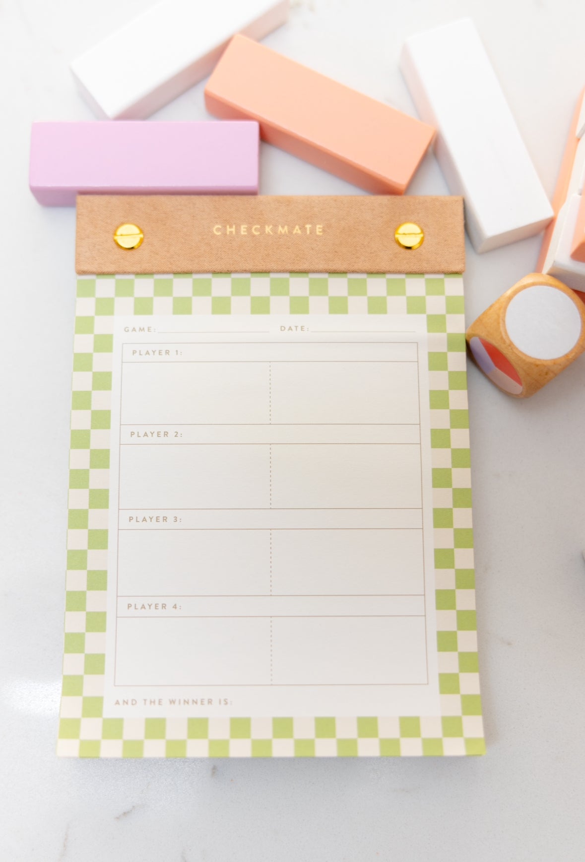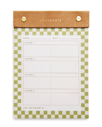 This cutest score pad we've ever seen! Take your game night to the next level! Keep score for a variety of games like cards, dominoes, charades, or trivia. This Checkmate Game Score Post-Bound Pad comes with 60 sheets for 4 players. 5 x 7 Score Keeping Notepad. Sueded Paper Header with Gold Accents. 60 Perforated Sheets with 4-Player Layout. Printed with Soy Based Inks on Acid Free Paper.
