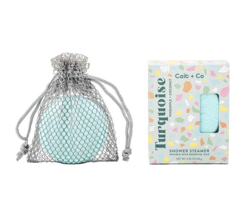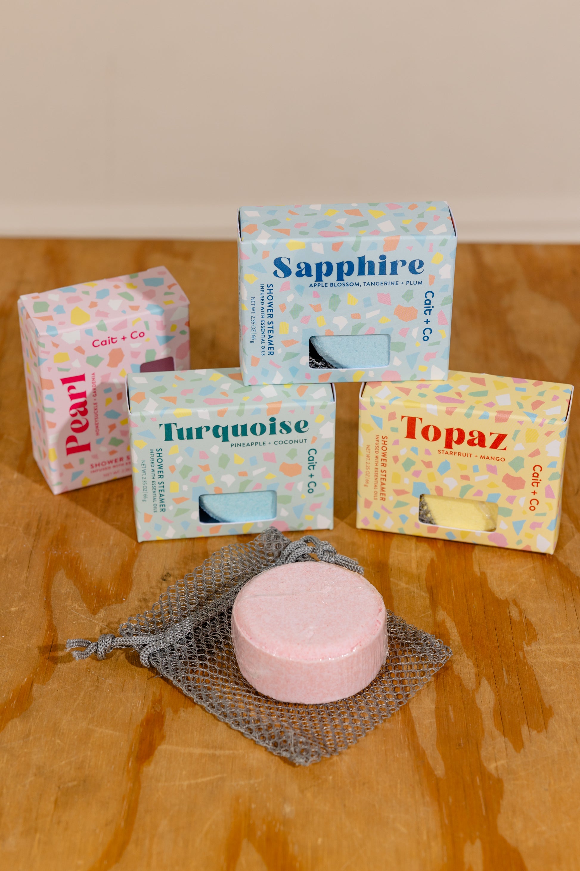 Transform your shower into a one-of-a-kind aromatherapy experience that will leave you feeling refreshed and reset. Each shower steamer is made with love in the USA and infused with essential oils, so breathe in deep - your body, mind, and soul will thank you! How To Use: First, let your shower get nice and steamy. To activate your aromatherapy experience, unwrap your steamer and place it in your mesh bag. Hold it under the flow of water until thoroughly wet and fizzing. Hang the bag anywhere outside of the direct stream of water. Lasts for approximately 2-3 showers | Includes mesh bag. Pearl- Smells like honeysuckle & gardenia. Sapphire- Smells like apple blossom, tangerine & plum. Topaz- Smells like starfruit & mango. Turquoise- Smells like pineapple & coconut.
