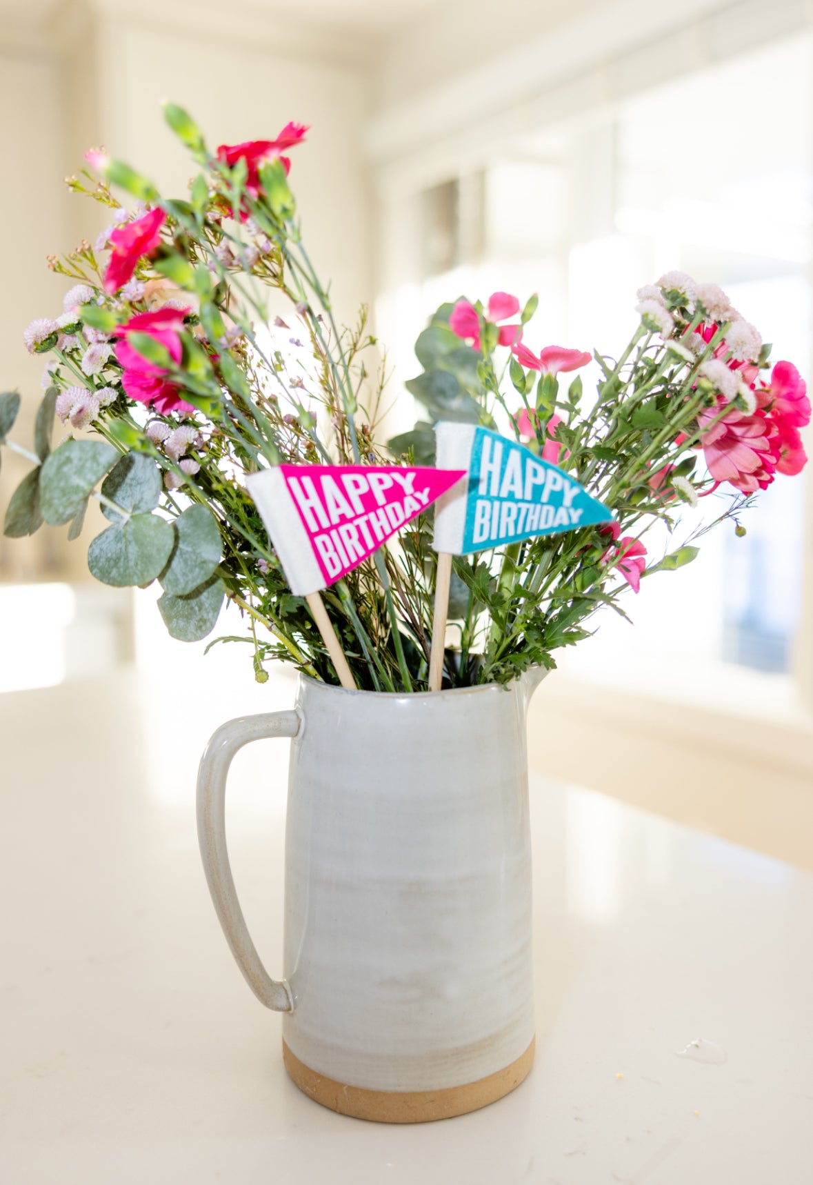 These Happy Birthday pennants are meticulously crafted in the USA from premium, domestically-sourced wool blend felt. Measuring 2.5 x 4 inches on a 12-inch wooden dowel.