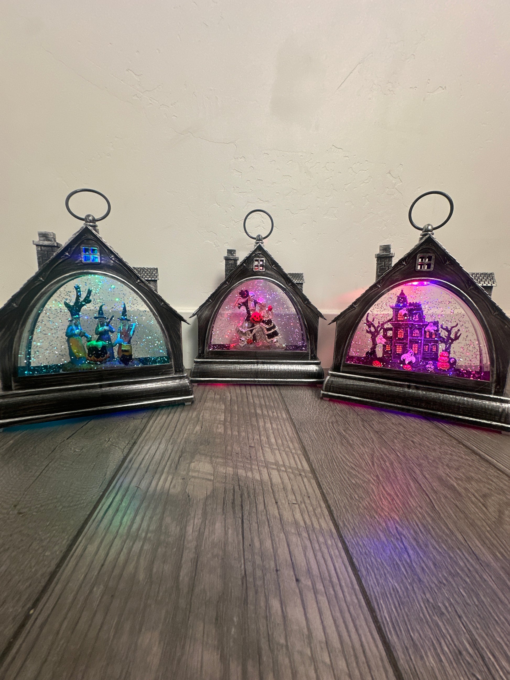 These lanterns might be our favorite piece from our Halloween decor! They are battery operated but also come with a USB cord. Once turned on, glitter swirls around and it lights up and changes all different colors. Such a fun piece to add to your decor!
