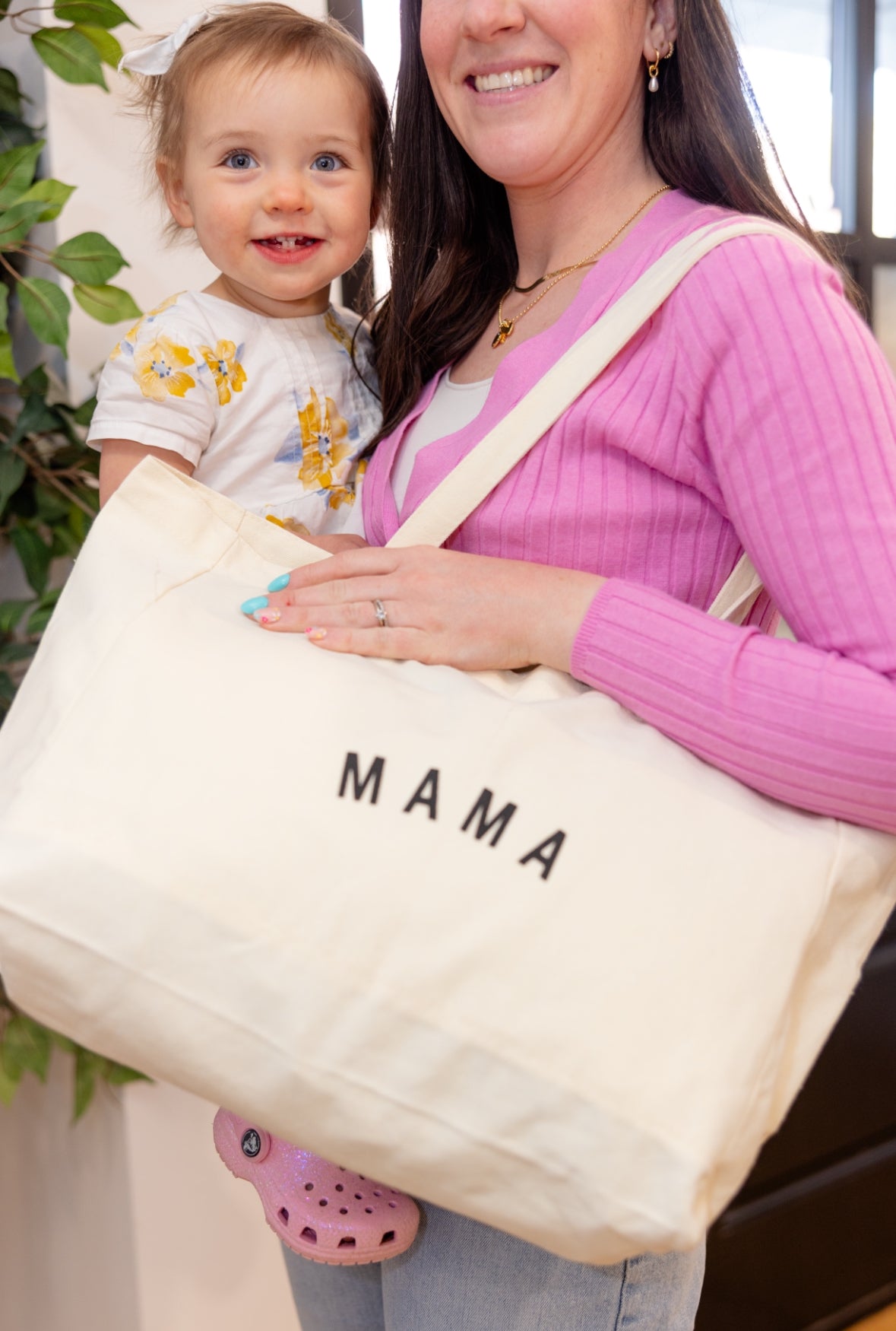 With six pockets on the inside, this canvas tote is a classy way to stay organized with all your mom and kid gear! A generous opening in the middle is perfect for bigger items while the smaller pockets can hold diapers, wipes, keys, phones, wallet, snacks, bibs, toys, etc. No more reaching into the deep abyss of a bag and resorting to it each time!