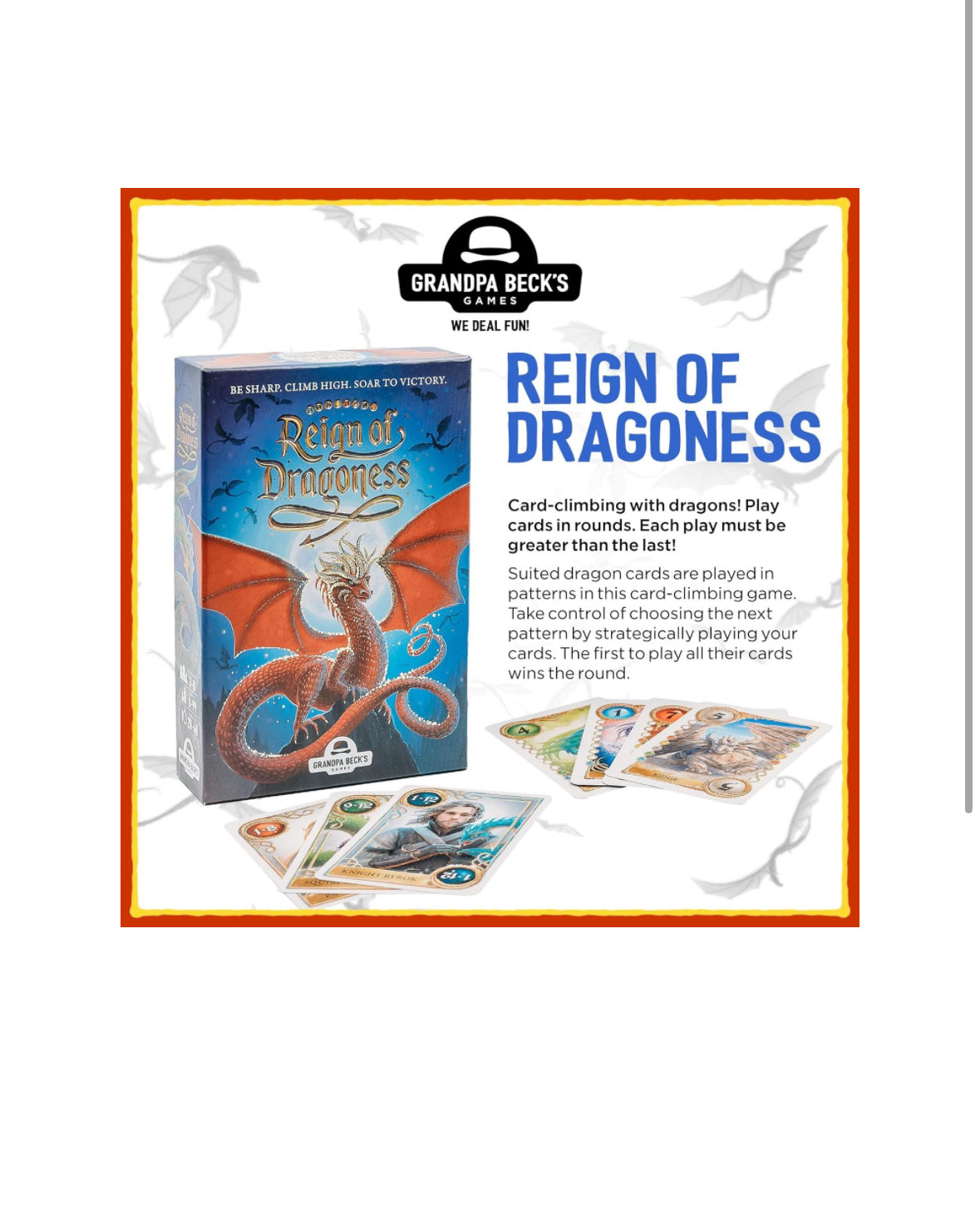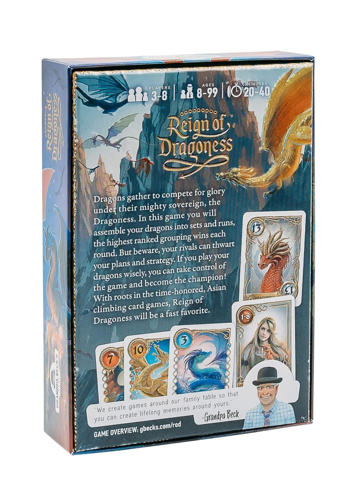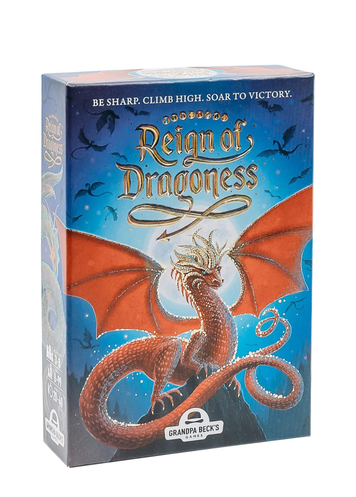 Reign of Dragoness is a twist on the time-honored ladder climbing card games. Use your dragons wisely to play your cards in sets and runs, trying to beat the cards played before you. The battle to play your cards before your competitors will be full of fun and strategy. Quick rounds will make this an addicting family favorite!