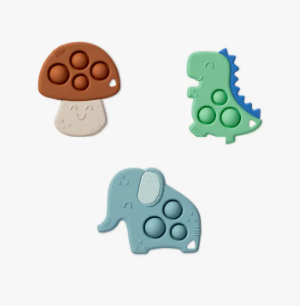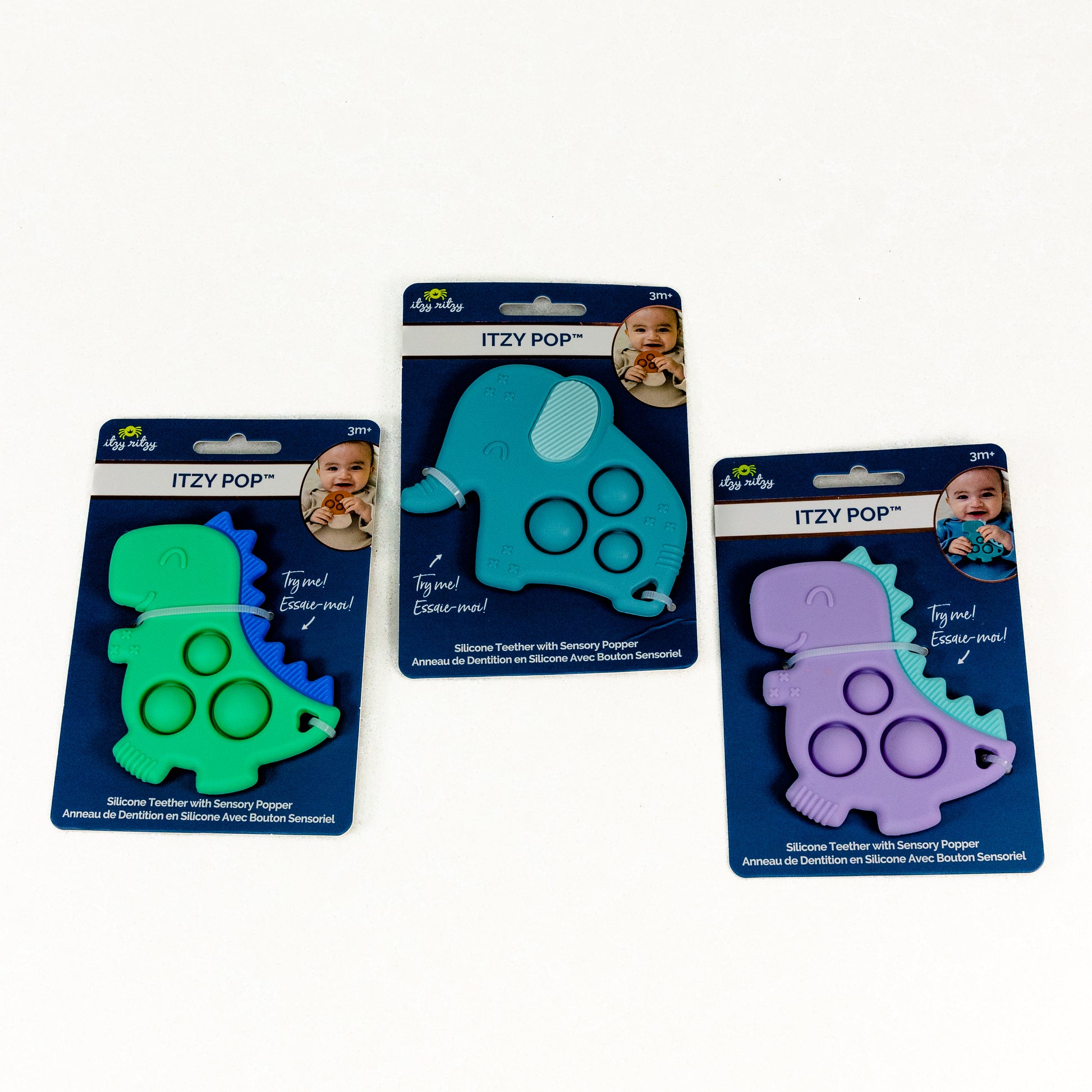 Chew on this! A pop of personality: a teething bestie and baby sensory toy all-in-one. This Itzy Pop push bubble toy is the perfect way to engage your little one's mind and senses. The push pop movement and sounds will keep baby's attention while the raised silicone dimples gently soothe sore gums.