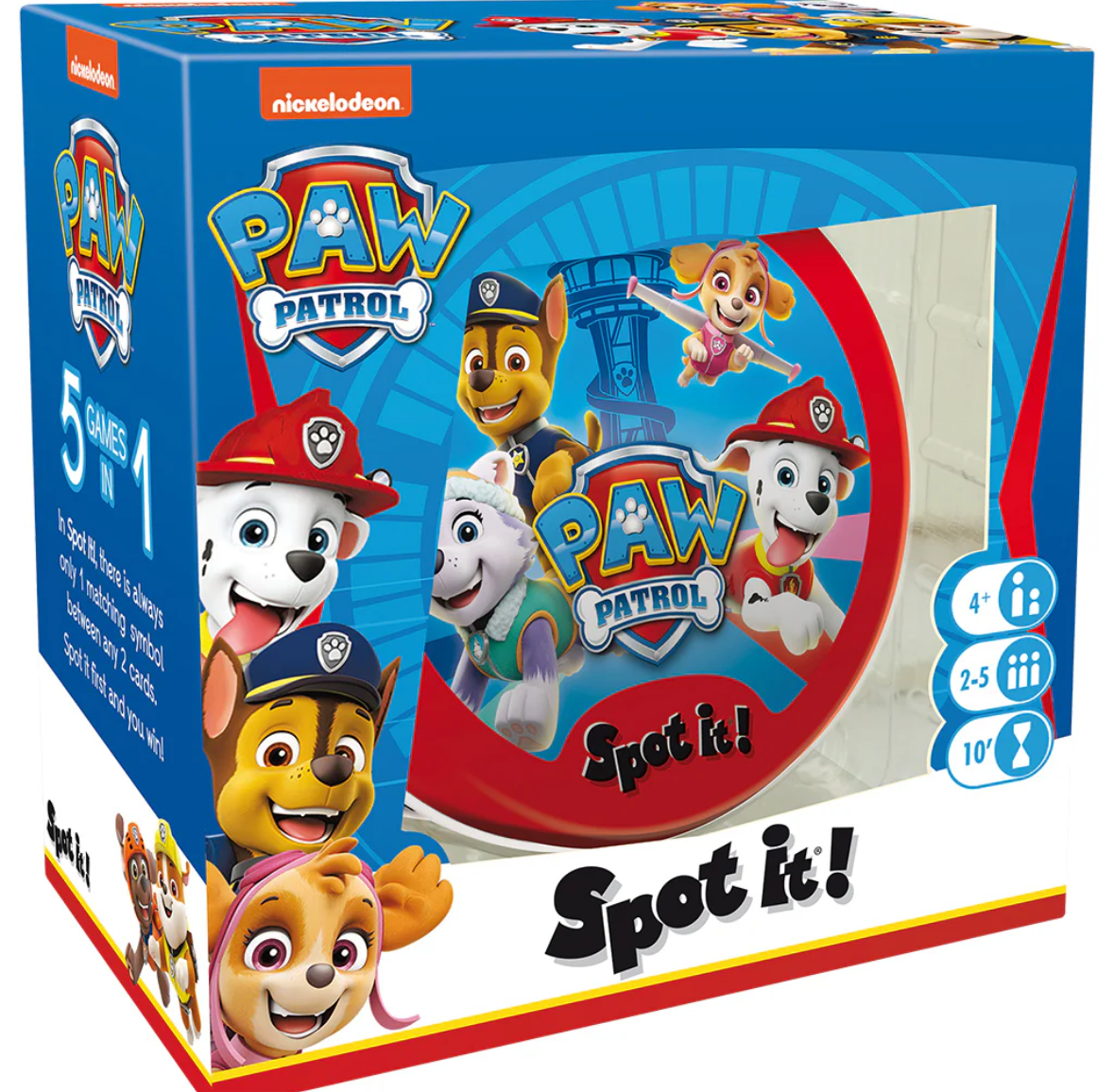 This new version of Spot It combines different characters from Paw Patrol with one of the most beloved family card games! Players try to spot the single matching character between two cards in a playful battle of speedy observation. Paw Patrol fans will keep race to spot their favorite characters like Marshall, chase, Ryder, Skye, and more!