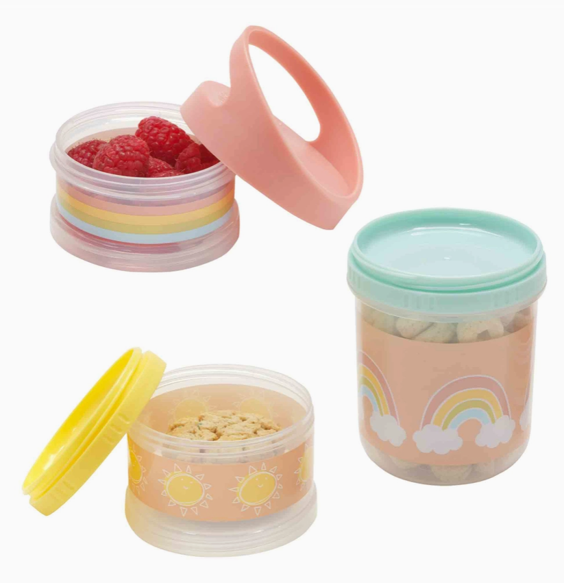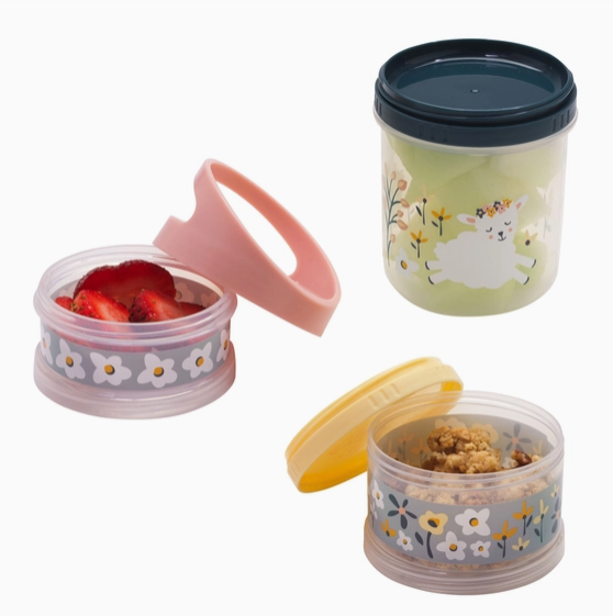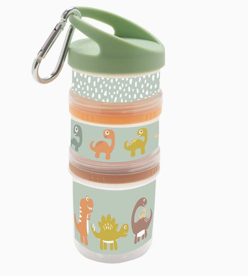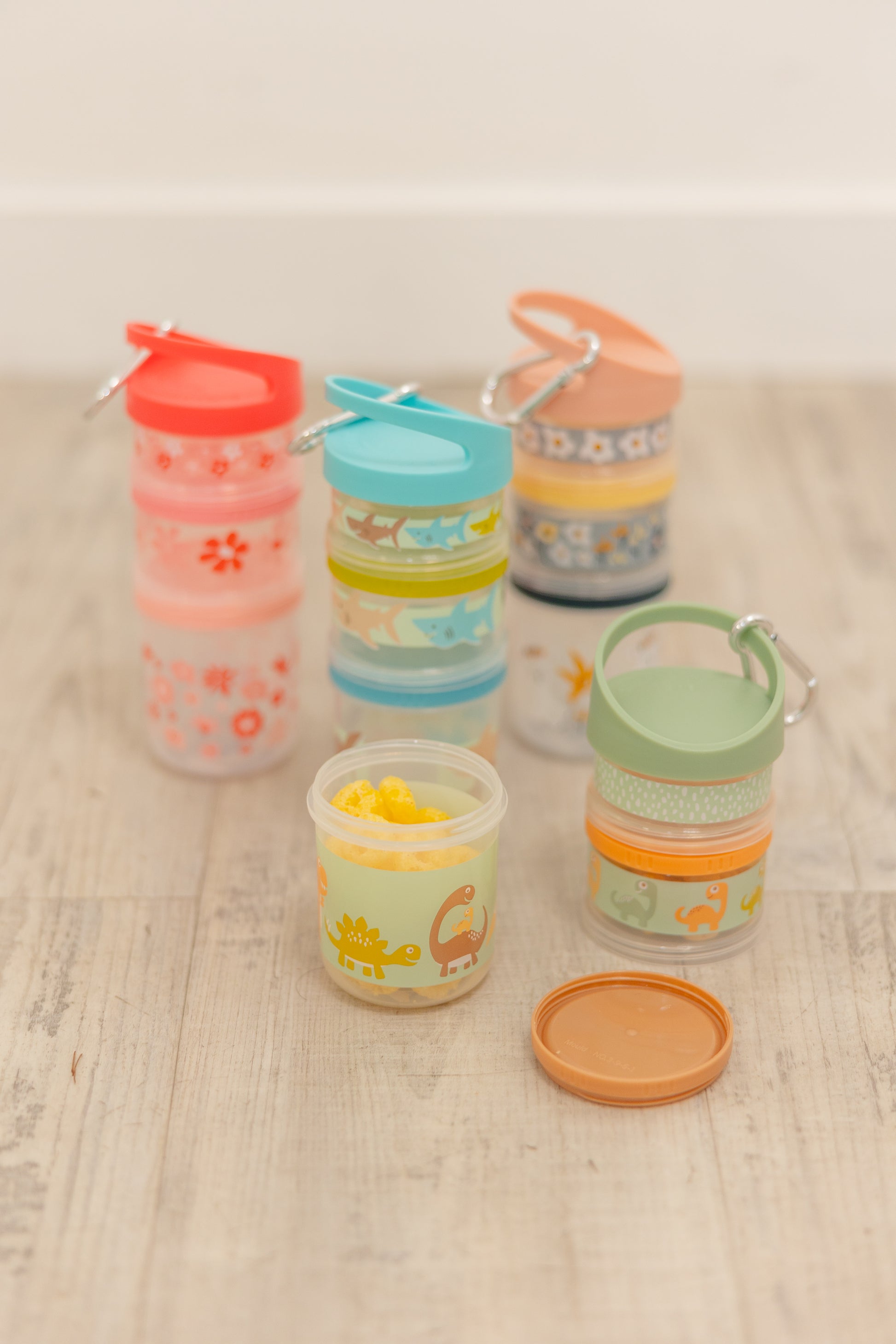 Twist & snack stacker is a stacking container for a couple snacks, or even powdered formula. Stackers eliminate the need for plastic bags and keep food stacked, separated, and simple. Easily pack a three-tiered snack in one step!