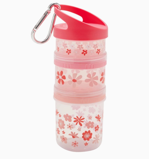 Twist & snack stacker is a stacking container for a couple snacks, or even powdered formula. Stackers eliminate the need for plastic bags and keep food stacked, separated, and simple. Easily pack a three-tiered snack in one step!